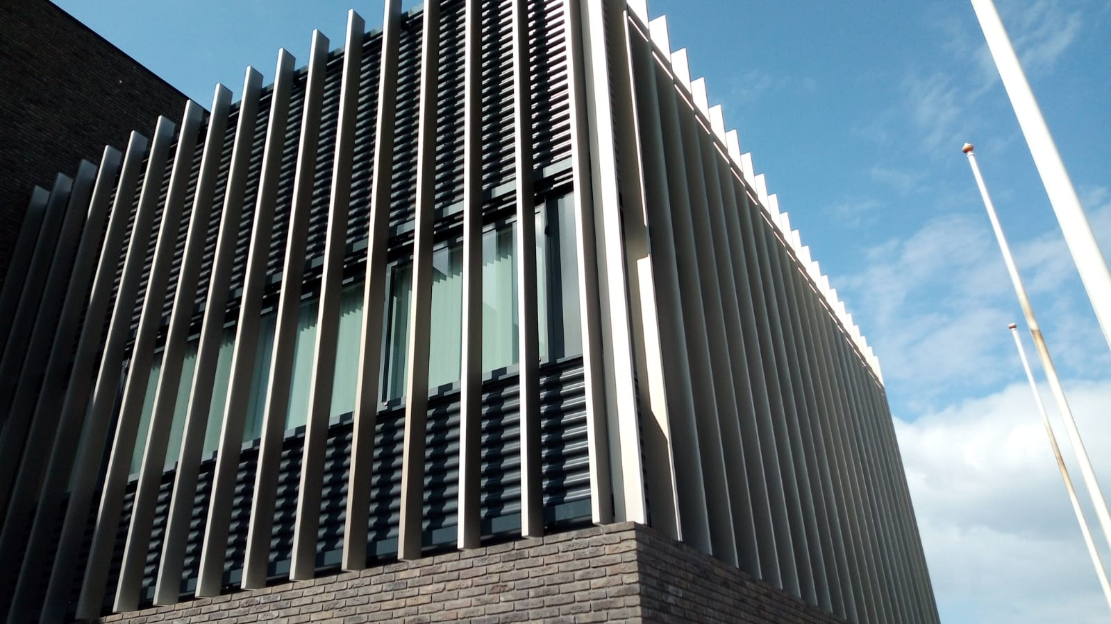 Bij de uitbreiding / renovatie van het pand van Ricoh Europe in Bergen op Zoom is ervoor gekozen de gevels van het kantoor te voorzien van verticale aluminium lamellen. IQstaal heeft de gevellamellen geleverd en gemonteerd